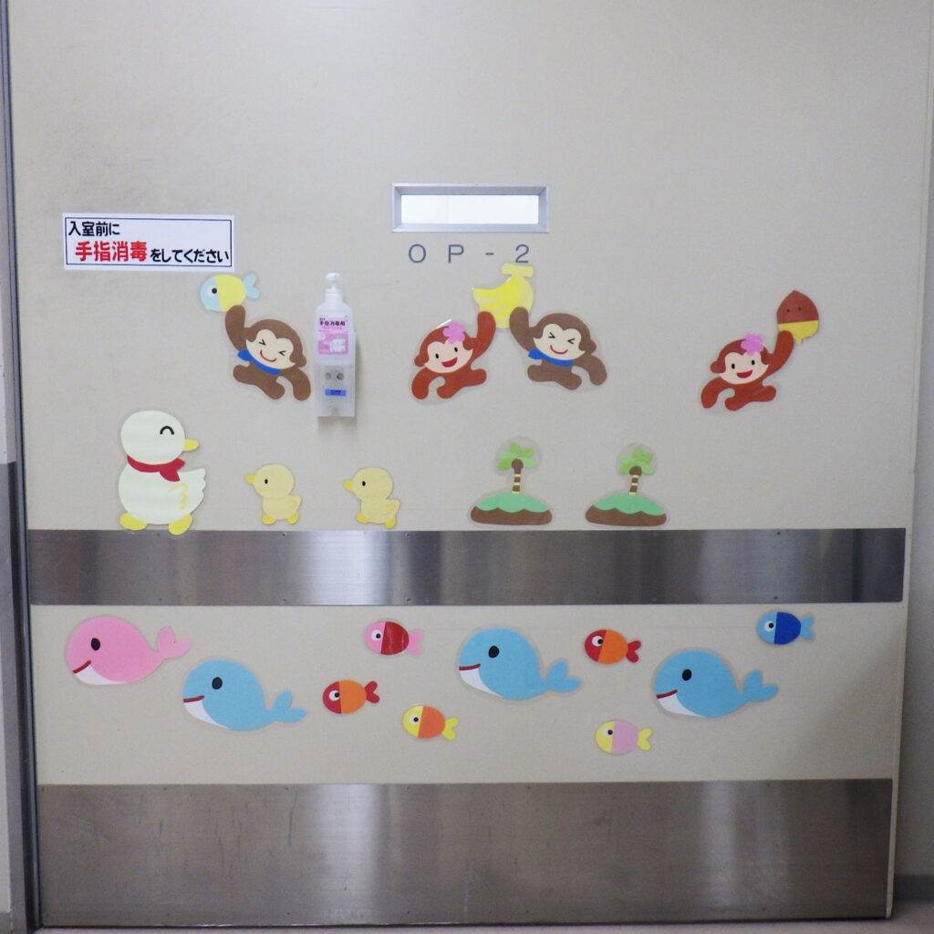 また、お子さんが手術室に入室する際には、お部屋の扉を可愛く飾り付け、無機質な環境に彩りを加え、緊張を和らげる工夫を行っています。